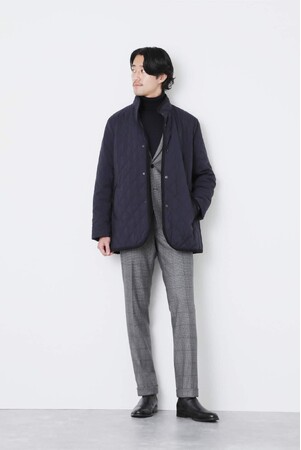英国のムードが漂うキルティングアウターは、ネイビースーツと好相性。ジャケットの裾が隠れるサイズ感に設定しているため仕事着としても活躍します。