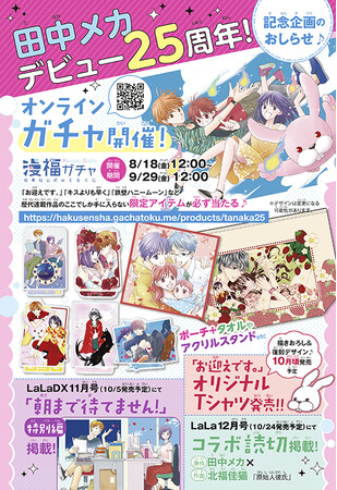 白泉社公式オンラインくじ「漫福ガチャ」に田中メカ作品が登場! 「お迎えです。」「キスよりも早く」「鉄壁ハニームーン」など、歴代連載作品のここでしか手に入らない限定アイテムが必ず当たる! ポーチ+タオルやアクリルスタンドなど、数々のアイテムをご用意しています。お楽しみに!