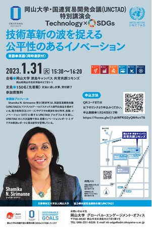 この度、UNCTADより、テクノロジー・ロジスティクス部門のシャミカ・シリマン局長を岡山大学へお招きし、テクノロジーとSDGsをテーマに、下記のとおり、2023年1月31日(火)に本学津島キャンパスに新築された岡山大学共育共創コモンズにおいて特別講演会を開催することとなりました。