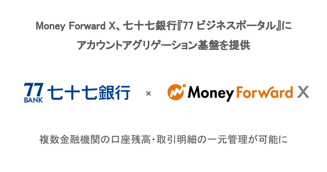 株式会社マネーフォワードは2023年11月21日(火)から、株式会社七十七銀行が提供する法人向け総合プラットフォーム『77 ビジネスポータル』に、アカウントアグリゲーション基盤を提供します。これにより、『77 ビジネスポータル』をご利用のお客さまは、七十七銀行以外の金融機関も含めた複数の口座残高や取引明細を一元管理できるようになります。