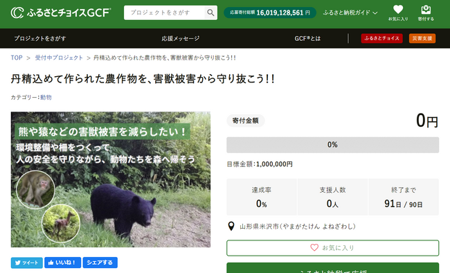 山形県米沢市(市長:中川勝、以下「米沢市」)と国内最大級のふるさと納税総合サイト「ふるさとチョイス」( https://www.furusato-tax.jp/ )を企画・運営する、株式会社トラストバンク(本社:東京都渋谷区、代表取締役:川村憲一、以下「トラストバンク」)は、本日12月5日トラストバンクが提供する、ふるさと納税制度を通じてクラウドファンディング型で寄付を募る仕組み「ガバメントクラウドファンディング(R)」(以下「GCF(R)」)で、クマを含めた鳥獣被害対策を目的としたプロジェクトを開始します。募集期間は2023年12月5日~2024年3月3日で、目標寄付金額は100万円です。