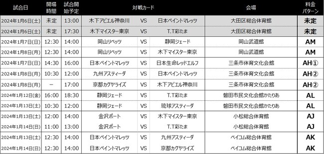 ・大田区総合体育館(1/6)の2試合は現時点では調整中となります。確定いたしましたら改めてお知らせさせていただきます。
