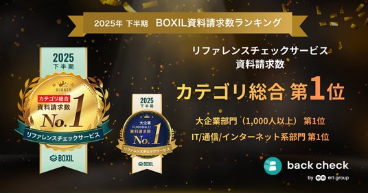 back check株式会社(本社:東京都新宿区、代表取締役:須藤 芳紀、エン株式会社100%出資)が提供するオンライン完結型リファレンスチェック、コンプライアンスチェックサービス『back check』(https://site.backcheck.jp/)は、スマートキャンプ株式会社(以下「スマートキャンプ」)が主催する「2025年下半期 BOXIL資料請求数ランキング」のリファレンスチェックサービス 総合1位に選出されました。併せて、同カテゴリの従業員規模別 大企業部門(従業員1,000人以上)1位、業界・業種別 IT/通信/インターネット系部門でも1位を獲得したことをお知らせします。