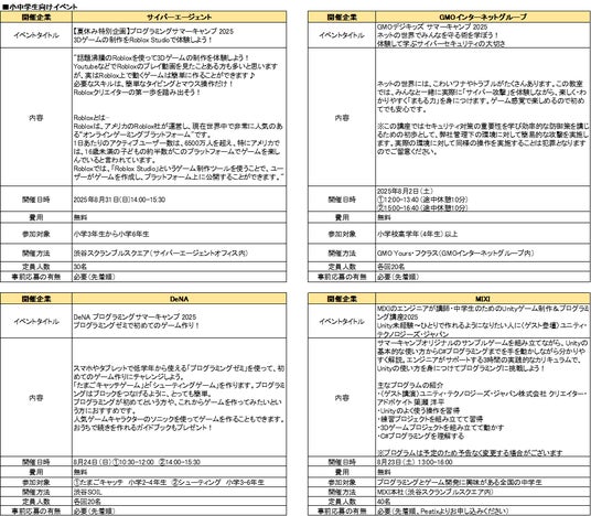 東急株式会社(以下、東急)、株式会社サイバーエージェント(以下、サイバーエージェント)、株式会社ディー・エヌ・エー(以下、DeNA)、GMOインターネットグループ株式会社(以下、GMOインターネットグループ)、株式会社MIXI(以下、MIXI)の5社は、2025年8月に小中学生を対象としたプログラミングイベント「Kids VALLEY 未来の学びプロジェクトpresentsプログラミングサマーキャンプ2025」(以下、「プログラミングサマーキャンプ2025」)を開催します。