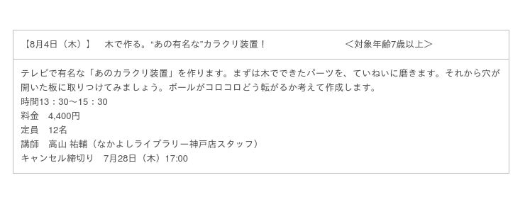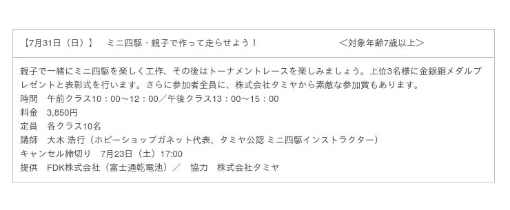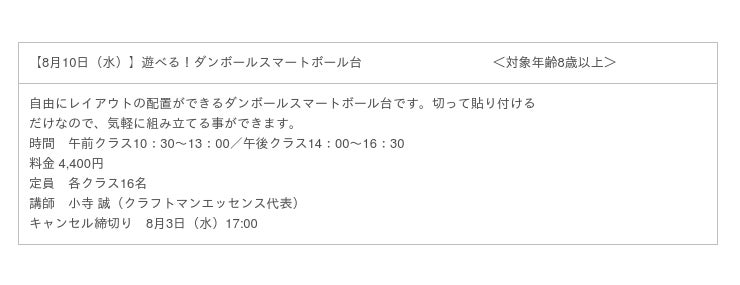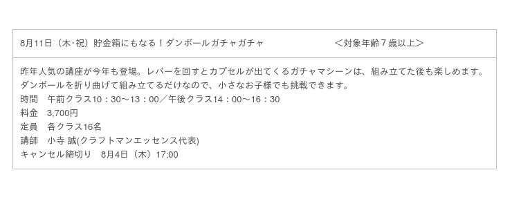 例年人気の「ミニ四駆・親子で作って走らせよう!」や「貯金箱にも使える!ダンボールガチャガチャ」など、お子様をはじめ大人の方だけでもお楽しみいただける講座が揃います。