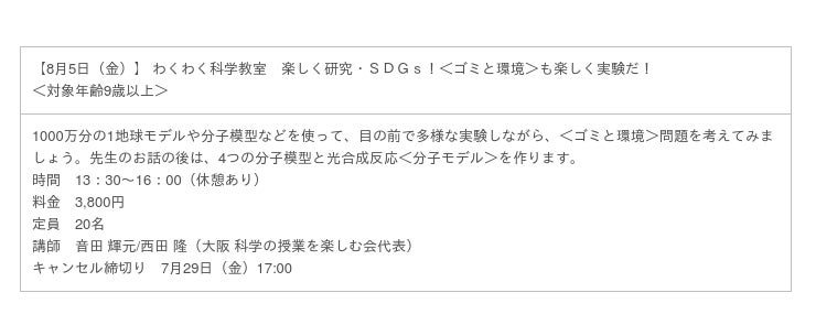 リーガロイヤルホテル(大阪市北区中之島、総支配人 中川 智子 )の文化教室「エコール ド ロイヤル」では、夏休み企画「リーガロイヤルホテルで夏を楽しもう!」を開催します。