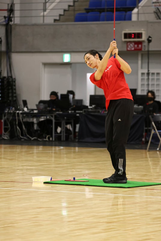 仲間が打ったゴルフボールを虫取り網でノーバウンドキャッチする競技。狙いを定める打者と、走り回る捕球役のコンビネーションが勝敗を左右し、会場からは「ナイスキャッチ!」の声が飛び交った。橘優輝が正確なボールコントロールを見せ、赤チームが勝利した。