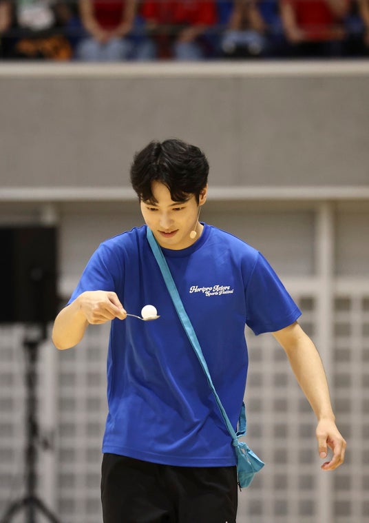 赤・青それぞれを2チームずつ、計4チームに分かれ、スプーンにピンポン玉を乗せて運び紙コップに入れる「ピンポン玉競争」と、お題の品を会場内から探して運ぶ「借り物競走」の2種目に挑戦し、ゴールを目指してタイムを競った。機転と体力、そして観客との交流が勝敗のカギとなった。ここまで3連敗だった青チームが1・2フィニッシュを決め、巻き返しのきっかけを掴んだ。