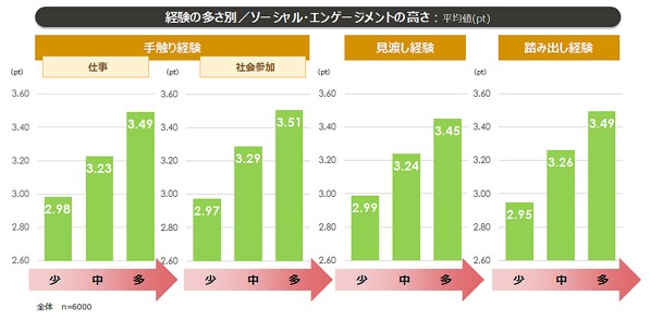 【4】 「手触り経験」「見渡し経験」「踏み出し経験」が多いほど、ソーシャル・エンゲージメントが高い。