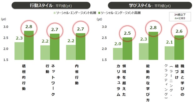 【5】 ソーシャル・エンゲージメントが高い若年層は、学生時代に「積極的に行動」し、多様な人と交流する「ネットワーク行動」や「内省」を行っていた人が多い。また、「職業と学びの紐づけ(ラーニング・クラフティング)」「領域を超えたカリキュラム」「能動的な学び」を行っていた。