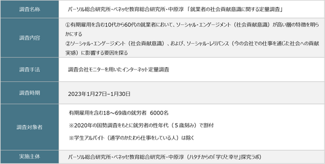 株式会社パーソル総合研究所(本社:東京都港区、代表取締役社長:萱野博行)と、株式会社ベネッセコーポレーション(本社:岡山県岡山市、代表取締役社長:小林 仁)の社内シンクタンクであるベネッセ教育総合研究所は、立教大学中原淳教授と共同で、就業者の社会貢献意識(ソーシャル・エンゲージメント)に関する調査(サンプル数6,000人)を実施し、結果を取りまとめましたのでお知らせします。