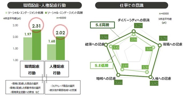 【3】 ソーシャル・エンゲージメント(S.E)が高い層では、環境配慮や人権配慮行動を行っている割合が高い。