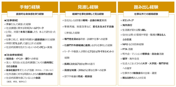 ソーシャル・エンゲージメントの高さには、学生時代・社会人の経験との関連が見られ、社会人領域では直接的体感を伴う「手触り経験」、仕事以外の越境経験である「踏み出し経験」、組織や仕事を俯瞰して見る「見渡し経験」といった経験が、ソーシャル・エンゲージメントを育てていることが示唆された。