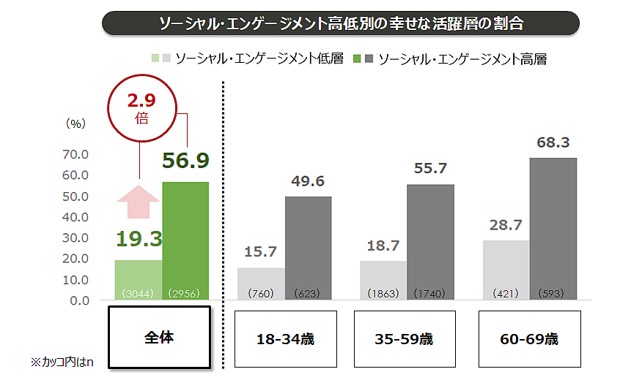 【2】 ソーシャル・エンゲージメントが高い層は、低い層と比べ幸せな活躍をしている人の割合が2.9倍。
