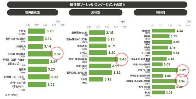 【1】 就労形態では「公務員・団体職員」、業種では「教育・学習支援業」、職種では「クリエイティブ職」「事業開発・商品開発・研究職」でソーシャル・エンゲージメントが高い。