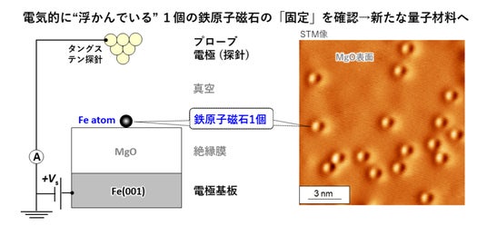 本研究では、厚さ約1 nmの単一鉄原子の安定性を、本学で開発した走査トンネル顕微鏡(STM)(注4)を用いて、超高真空・極低温(マイナス268.5℃)で検証し、厚さ1 nmのMgO絶縁膜上であっても鉄原子は強固に吸着し、安定した量子スピン状態を保持できることを示しました。(図)。