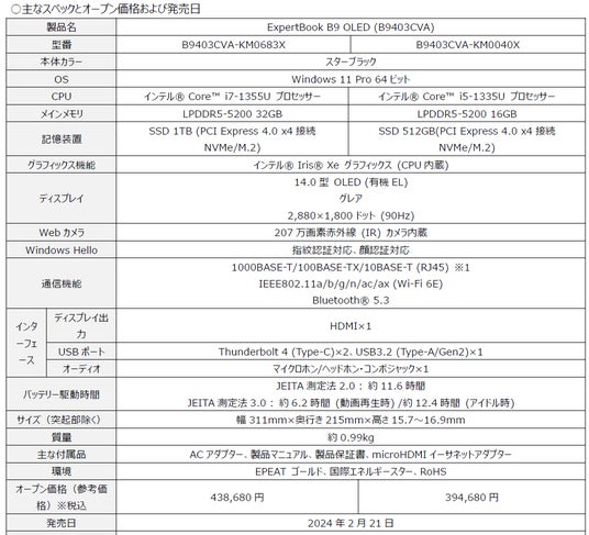 製品情報:https://www.asus.com/jp/laptops/for-work/expertbook/expertbook-b9-oled-b9403-13th-gen-intel/