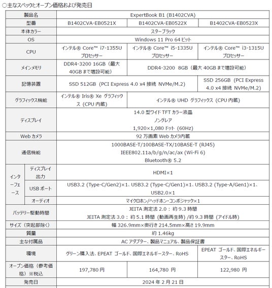 製品情報:https://www.asus.com/jp/laptops/for-work/expertbook/expertbook-b1-b1402-13th-gen-intel/