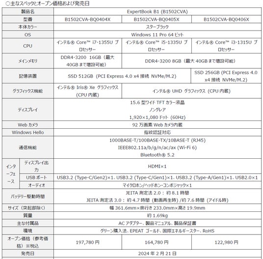 製品情報:https://www.asus.com/jp/laptops/for-work/expertbook/expertbook-b1-b1502-13th-gen-intel/