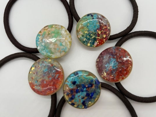 美しいジュエリーができる過程で生まれる石のカケラ。それらを集めて透明な樹脂で固めると、その艶感と天然石のカラーミックスが相まって、まるで”モザイク”のような完成度に。クラフト感のある温かみがプラスされた仕上がりはひと味違う魅力を放ち、アガットではリングやチャームなどのデザインに施され、隠れた人気アイテムにもなっています。今回のイベントでは、そのテクニックを使ったオリジナルのヘアゴムが作れます。