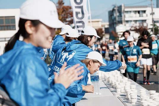 大会当日は、運営スタッフが当社製のウエアを着用し、当社従業員も給水サポートのボランティアを実施。運営スタッフのウエアとキャップは任意で回収され、クリーニングの上、次回の大会で再利用されます。