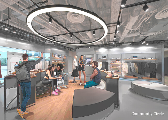 「ニューバランス広島PARCO」では、店舗での体験を新しくデザインし、中心に“商品”ではなく“人”を据えています。売り場に象徴的に設置したコミュニティサークルを中心に空間を作り、スタッフとお客様、そしてお客様同士のコミュニケーションが自然に生まれるように設計しています。人々が集い、互いにインスピレーションを得ながら、自分らしいスタイルを見つけることを目指した店舗です。フットウェアとアパレルを織り交ぜてディスプレイすることで、生活の中で使用しているシーンを思い描きながらショッピングを楽しむことができます。厳選された商品と、それらの商品の開発背景などを店舗デザインに落とし込んだビジュアルストーリーテリングによって、商品の背景にある作り手やオリジンにスポットを当て、お客様それぞれがイマジネーションを膨らませられるようにデザインされています。