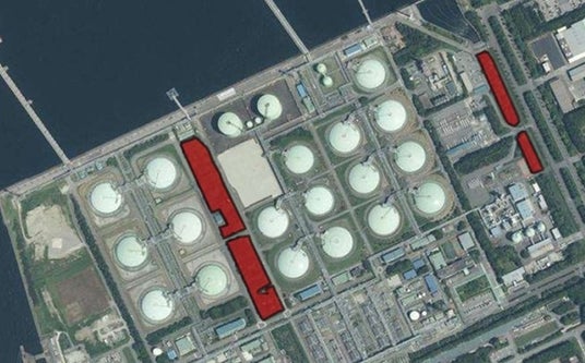 袖ケ浦LNG基地の全景と「自然共生サイト」に認定された緑地(着色部分)