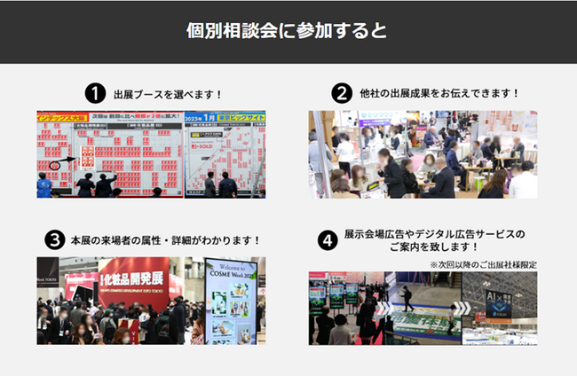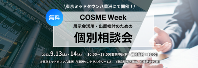 RX Japan株式会社が主催する「COSME Week」は、化粧品・美容に関する日本最大級の国際商談展です。年に2回、東京と大阪で開催しています。今回の相談会では他社の出展成果を交えながら、企業ごとに最適な提案ができるよう、個別形式で実施いたします。(無料 ※事前予約制)
