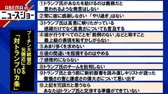 2025年3月16日(日)の放送では、ロシアのプーチン大統領の元側近が作成した「対トランプ10カ条」なるアメリカのトランプ大統領の“取扱説明書”を紹介しました。