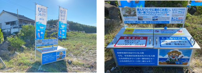 また照島海岸では、ボランティアの方々により、毎朝5時から11時くらいまでごみ拾い活動が行われています。今回、本活動を見た地域の方々の意向もあり、照島まちづくり協議会から「地区として海岸清掃に取り組むために海岸の美化活動や拾い箱の管理をしたい」とのことで、今回の設置に至りました。「拾い箱」のデザインには、地元いちき串木野市でおなじみのキャラクター「うんまかせんにん」が描かれており、「自然を壊すのはワシら人間。でも、守ることが出来るのもワシら人間。心も自然もクリーンが一番なのじゃ。心も自然もクリーンが一番じゃぞ」というメッセージ性の強い、照島オリジナルのデザインとなっています。