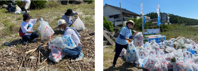 ごみ拾いには、照島小学校の協力もあり、地域の方々合わせて約100人が集まりました。一見キレイにみえる照島海岸ですが、よく見るとかなりのごみが落ちていました。台風の後ということもあり、他から流れ着いたごみも多くあり、およそ1時間で一杯になった30Lのごみ袋が100袋以上集まりました。ごみは、プラスチックやガラス、陶器の器など燃えないごみが多く、中には、マリンスポーツに使うボードやボールなど、観光地ならではのごみも多くみられました。