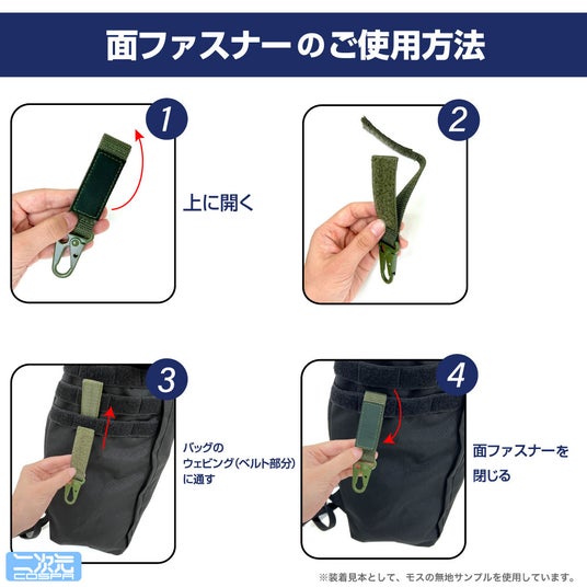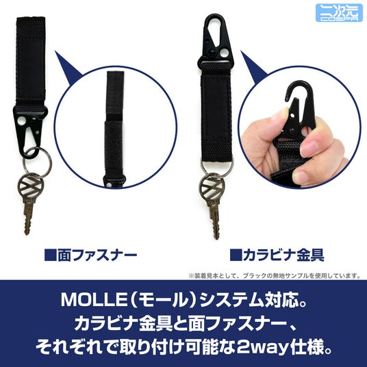・MOLLE(モール)システム対応。カラビナ金具と面ファスナー、それぞれで取り付け可能な2way仕様。