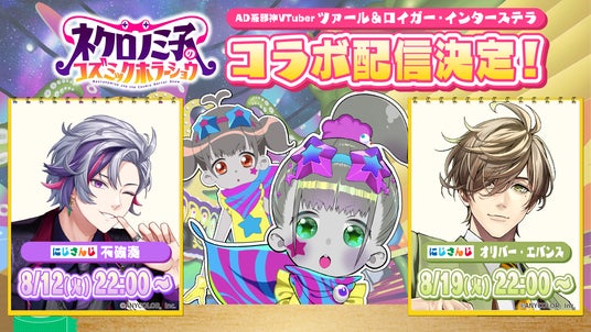 TVアニメ「ネクロノミ子のコズミックホラーショウ」の作中では邪神として登場している、本作の公式VTuber「ツァール&ロイガー・インターステラ」と、先日放送の第6話でゲスト出演したにじさんじ所属のバーチャルライバー「不破湊」「オリバー・エバンス」とのコラボ配信が決定!