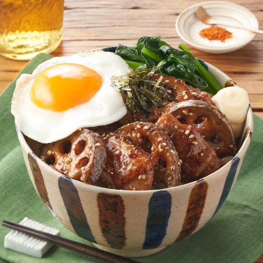 農家オブザイヤー金賞受賞「もちうまステーキれんこん」の厚切りと鶏肉を合わせた、食べ応えのある丼です。にんにくを効かせた角煮だれに目玉焼きがとろりとからみ、シャキもち食感のれんこんでごはんがすすむ一杯に仕上がっています。