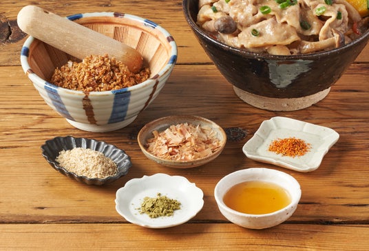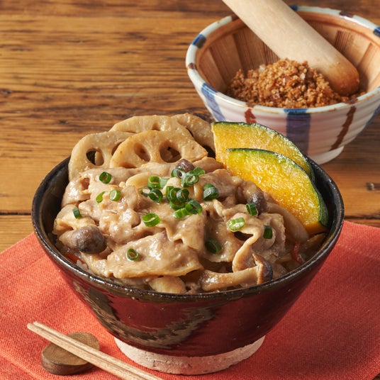 「ほうとう」の味わいを丼にアレンジ。豚肉や根菜をコク深い味噌で煮込み、もっちりおこわに合わせました。決め手は、七味や山椒を調合して作る辛味調味料「すりだね」。出汁の旨みと香りが素材を引き立てる、新感覚の郷土風メニューです。