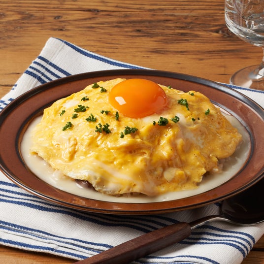 ベーコンやごろっとれんこんの入ったごはんを、ふわとろのたまごで包んだオムライス。チーズホワイトソースと絡めながら食べると、まるでカルボナーラの味わいです。たまごの美味しさを堪能できるメニューです。