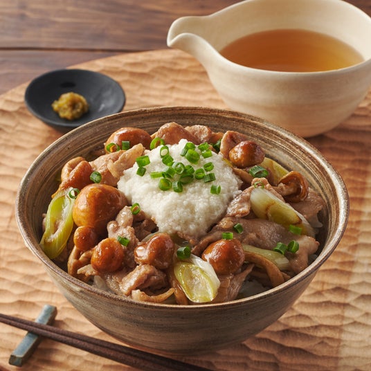 国産豚肉と農家オブザイヤー受賞「足長なめこ」を特製出汁で香り高く炒め合わせました。とろろのまろやかさと、ピリッとさわやかな柚子胡椒がアクセント。丼として楽しんだ後に温かい出汁を注げばお茶漬けに。一杯で二度おいしい丼です。
