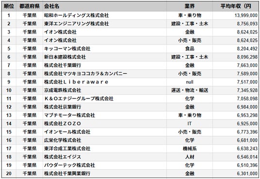 株式会社SalesNow(本社:東京都渋谷区、代表取締役:村岡功規、以下「当社」)は、国内540万社の企業情報を完全網羅した日本最大級のデータベース「SalesNow DB」より、上場企業を対象に千葉県に本社を置く企業の平均年収データを集計・分析し、「平均年収ランキング」として公開いたしました。
