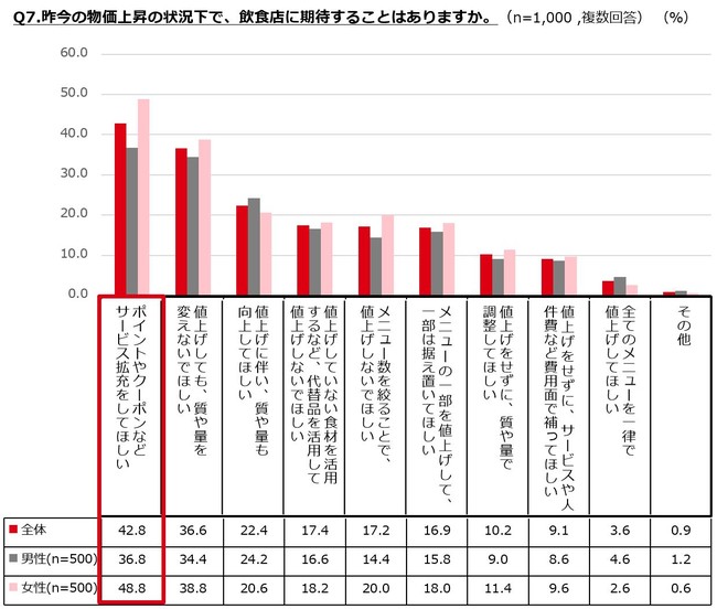今後、飲食店に期待することは「ポイント」や「クーポン」といったサービス面の拡充を求めている人が最も多く、外食の値上げを受け入れながら、一方で「お得感」を求めている人が多いことが分かりました。