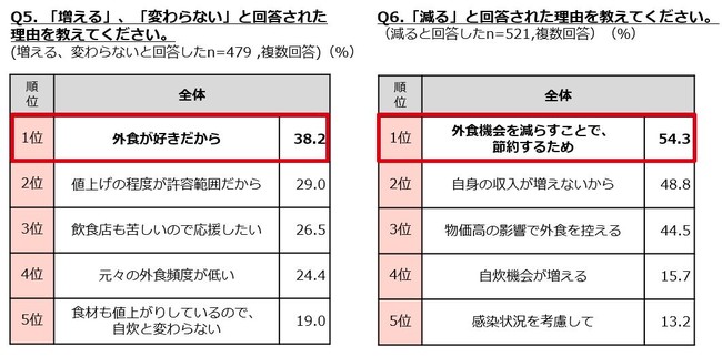 ・「増える」「変わらない」と回答した理由は「外食が好きだから」が1位。
