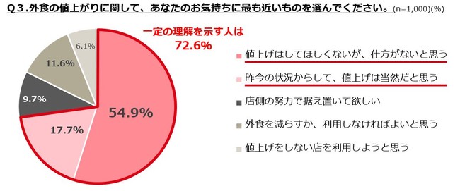 ・外食の値上げは「仕方がない」が55%、「値上げは当然」が18%と、7割以上の人が理解を示す。