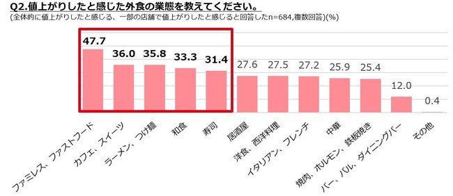 ・値上がりしたと感じる業態は「ファミレス、ファストフード」が半数弱で最も多く、「カフェ」「ラーメン」「和食」「寿司」は3割以上。