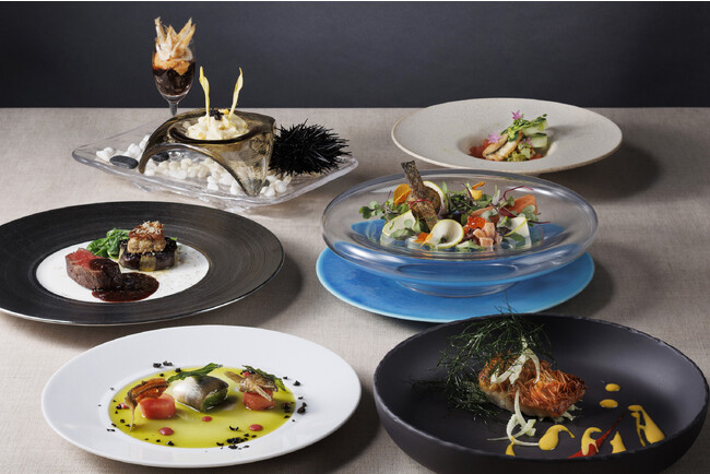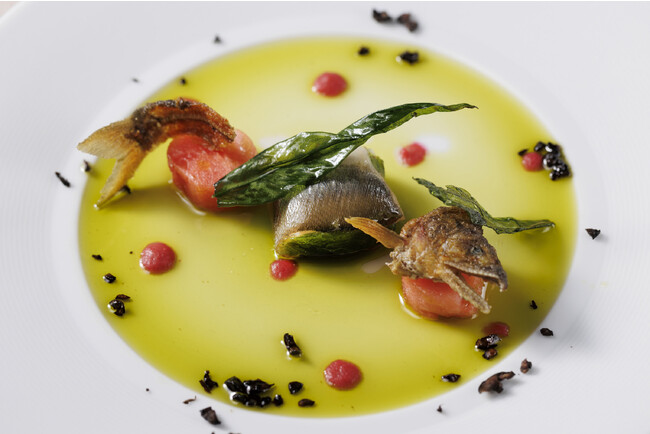 冷前菜では、白神山地に隣接する青森県鰺ヶ沢町で養殖され、鮮やかな紅色の身で繊細な味わいが特徴のイトウをご用意。脂がのりジューシーなハラミのコロッケ、古代米と合わせたタルタル、切り身の食感をダイレクトに感じていただけるマリネの3種類の異なる調理法を用い、イトウの味わいを存分にお楽しみいただけます。温前菜では、同源流の赤石川で獲れ、金色を帯びている「金のアユ」に低温で火を入れ旨みを凝縮させ、さわやかな辛味が特徴の鮎蓼(あゆたで)と合わせ、涼を感じる一皿に仕上げました。肉料理は、キメが細かく柔らかい食感の米沢牛をフォアグラと合わせたロッシーニスタイルで。芳醇な香りのトリュフソースが肉の旨みを引き立てます。そのほか、とうもろこしのエスプーマに宮城県産のガゼウニを添えたアミューズや、皮面をパリパリに松笠スタイルで焼き上げた甘鯛にスパイス香るサフランソースを添えた魚料理など、東北の夏の恵みをふんだんに使った品々をお楽しみください。