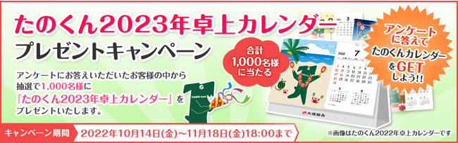 株式会社大塚商会は、オフィス通販サービス「たのめーる」にて、2022年10月14日(金)よりダジャレCMでおなじみのキャラクター『たのくん』の卓上カレンダーが抽選で1,000名様に当たるキャンペーンを開催しています。