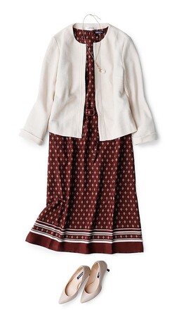 秋のオケージョンにぴったりなドレススタイル。ジャケットは袖口を折り返し、手首をみせることで程よい抜け感をプラス。パールとコインのデザインネックレスを合わせれば上品な華やかさに仕上がります。