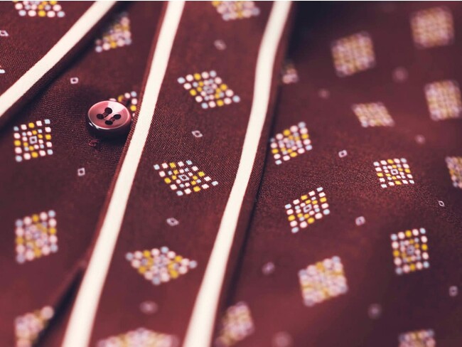 カレイドスコープのキラキラ輝く様子を、カラフルなクリスタルから成るダイヤ柄で表現。ネイビーベースには、ホワイト、オレンジ、パープルの3色。ボルドーベースには、ホワイト、イエロー、サックスの3色を組み合わせ、秋冬らしいクラシカルな印象を持たせました。ここに額縁のようなライン柄を配していきます。ミリ単位で幅調整を行い、品の良さを際立てるプリント柄が完成しました。