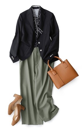 大人のブレザーコーデは甘辛バランスが重要。レディライクなボウタイブラウス&ヒールに、マニッシュなカーキのパンツがちょうどいい塩梅です。ブラウン系の小物をプラスすれば秋らしさも◎。