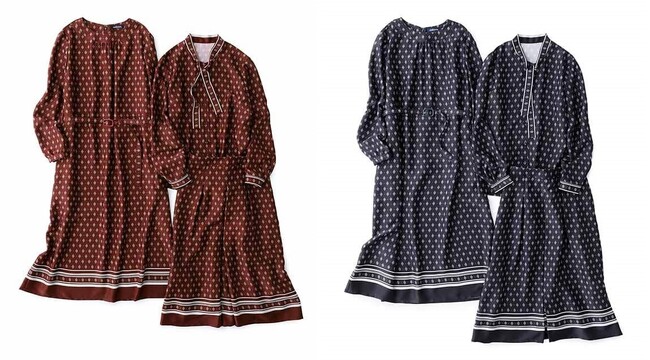 それぞれアクセントとなるラインがポイント。クルーネックドレスは、共地ベルトでシルエットの変化が楽しめます。ボウタイブラウスは、1枚着はもちろん、ジャケットのインナーとしても映える華やかさが魅力。タックフレアースカートはヒップ辺りまで中縫いを入れることで、腰回りがスッキリし、軽やかで品のある印象です。
