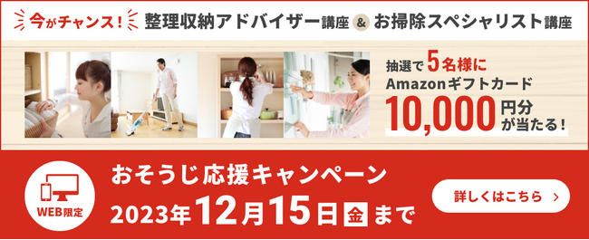 通信教育を手掛ける株式会社ユーキャン(所在地:東京都新宿区、代表取締役社長:品川 泰一)は、2023年12月1日(金)より「おそうじ応援キャンペーン」を開始しました。2023年12月15日(金)まで、「整理収納アドバイザー講座」または「お掃除スペシャリスト講座」を当社WEBサイトからお申込みいただいた方の中から抽選で5名様にAmazonギフトカード1万円分をプレゼントいたします。