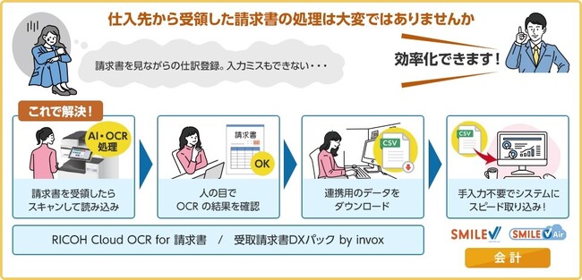 受領した請求書のデータ入力を手作業で行おうとすると、膨大な時間がかかるとともに、ミスが発生する恐れがあります。「RICOH Cloud OCR for 請求書」「受取請求書DXパック by invox」なら、スキャンデータから自動で仕訳登録が可能です。あとはデータをダウンロードして「SMILE V 2nd Edition 会計」に取り込めば完了。人の手によるミスが発生しないだけでなく、業務を効率化できます。